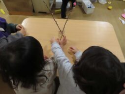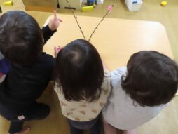 こどもたちに花が咲いたことを伝えると「みたい!」と集まってきました。最近、だいち組の子たちは色に興味をもっているため、花の色を聞くと「ぴんく!」と元気よく答えていました。ほかにも葉っぱや木の枝があることにも気づき、「みどりもあるね」「これはなにいろ?」と話しながら花の観察を楽しんでいました。満開になるのが楽しみです。