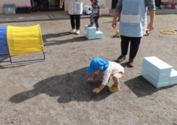 階段を登り少し高めの位置から上手に足腰を使い、着地をしています。まだ、「怖い」と伝える友だちには保護者と手を繋ぎ一緒に階段ジャンプをするなど、子ども一人ひとりに合った内容になりました。いつもより高めの位置でジャンプをすると満足そうに微笑み自信につながっていったと感じています。