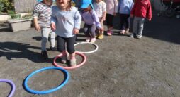 2歳から3歳になると、以前よりも体力がつきたくさん体を動かす場面が増えています。その中でも、そら組はジャンプが大好き。園庭での好きな遊びもフラフープを使った”けんけんぱ”や少し高いところからのジャンプです。スポーツデイの中にもジャンプをたくさん取り入れました!