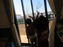風の強い日には保育室の窓を少し開け、廃材で作った凧をつるしています。