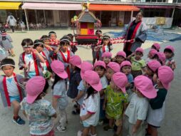 園庭にある御神輿や牛鬼に興味津々の子ども達。