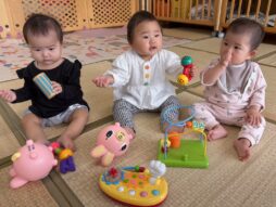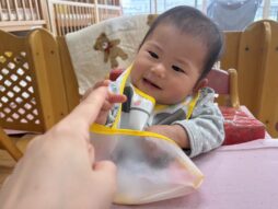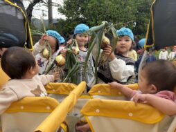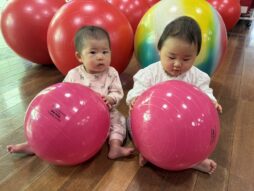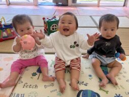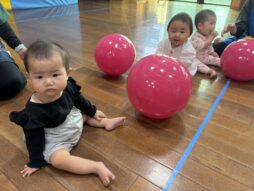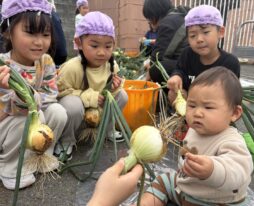 少しずつ園生活にも慣れ、室内あそびの他にも、玉ねぎの収穫を見に行ったり、バランスボールを体験したり(子育て支援のバランスボール講座に一緒に参加しました)友達や先生、おにいちゃん・おねえちゃん達との交流を楽しみました♪色々な活動に興味津々の子ども達でした。