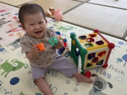 少しずつ園生活にも慣れ、室内あそびの他にも、玉ねぎの収穫を見に行ったり、バランスボールを体験したり(子育て支援のバランスボール講座に一緒に参加しました)友達や先生、