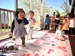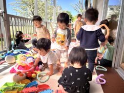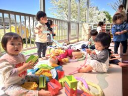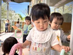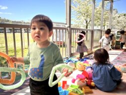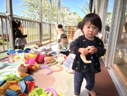 気持ちのいいお天気の中、テラスに出て遊びました。大好きなジョイントチューブやアンパンマンのぬいぐるみを見つけて上機嫌!