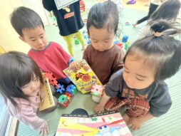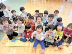 集まりの時間は、絵カードや手遊びをみんなで楽しんでいます。”♪おやつをたべよ(手遊び)”では、「♩せんべい・・・べぇぇ!!ちくわ・・・わっっ!!」
