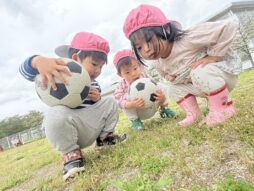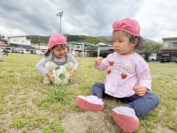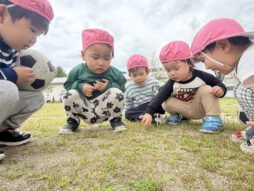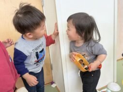 と、表情豊かに楽しんでいました。戸外遊びでは、蝶やてんとう虫をみつけて大喜び!「待て待て〜!」と、追いかけていました。友達や先生との関わりが増えています♪