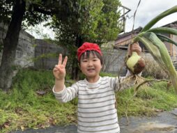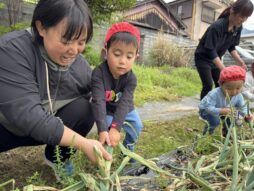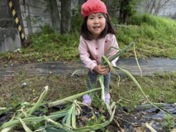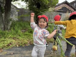 畑にできた、たくさんの玉ねぎを収穫しました!両手でしっかり根っこをもって・・・「んー!よいしょ!」と力一杯抜く子ども達。たくさん収穫できたので、各家庭にも持ち帰りました♪