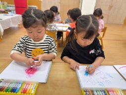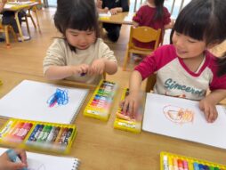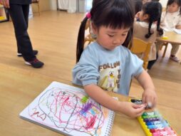 室内で、お絵描きを楽しみました♪色々なクレパスを使って、色鮮やかに・・・。絵をかいて楽しむことができました♡
