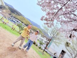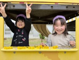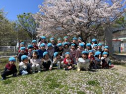 桜がきれいに咲いていたのでみんなで「はい、チーズ!」桜が舞っているところを見て「うわー!雪みたい!」大興奮の子ども達です♡