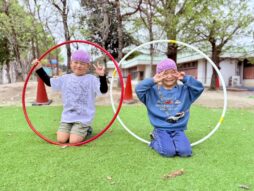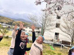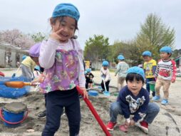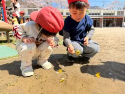 地よい風や暖かい陽射しの下で、滑り台やブランコ、かくれんぼ等、たくさん体を動かして遊んでいます。また、園庭に咲く桜やチューリップを見て「いっぱい咲いてるよ」