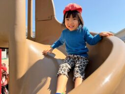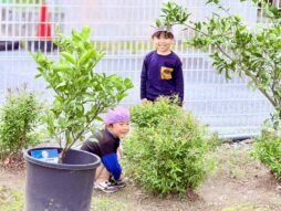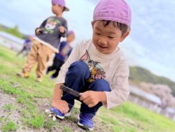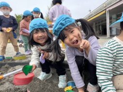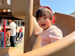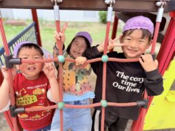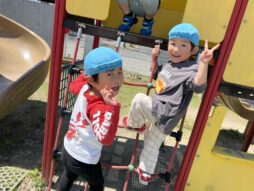 外で元気いっぱい遊んでいる3歳児!滑り台を楽しむ姿や、春の花・虫を見つけて友達や先生達と楽しく会話する姿が見られています。