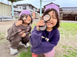 「桜ってピンクっぽいのもあるし、白もあるね」「どっちもかわいい」と会話を広げていました。散歩では、虫眼鏡を持って春探し。