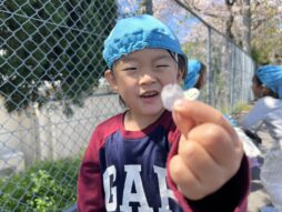 と見せてくれたA君。素敵な発見にほっこりしました♡園庭に咲いている桜にも興味津々!「届くかなー?」と一生懸命、手を伸ばしていました♪
