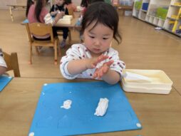 3歳児になって、粘土遊びを楽しみました♪粘土をこねこねして、ドーナツやへびさんを作りました。また、たくさん作って遊ぼうね☆